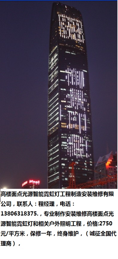 珠海市高楼面点光源智能霓虹灯工程制造安装维修有限公司,联系人:程经理,电话:13806318375.,专业制作安装维修高楼面点光源智能霓虹灯和相关户外照明工程,价格:2750元/平方米,保修一年,终身维护,(诚征全国代理商),亮化彩灯LED点光源:是一种新型的节能环保装饰灯,采用LED冷光源发光,内置微电脑芯片,可任意编程控制,多个同步变化,单色变化也可以实现同步七彩渐变,跳变,扫描,流水灯全彩变化效果及多个led点光源组成点阵屏。可变化出各种图画,文字和动画效果,是线形光源及泛光照明的一个补充,外形美观大方可满足楼体等装饰的点线面的设计要求。LED点光源使用铝质底座,散热,防水性能极佳,安装便利,控制简单,使用低压供电,安全可靠,外观大气高贵,是楼体,桥梁轮廓,酒店,广告牌、幕墙和夜场灯光照明的理想装饰品。